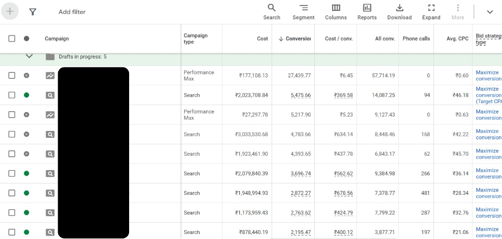 ✔ 4. Optimized bidding – Moved them to Maximize Conversions / Target CPA to control cost.
